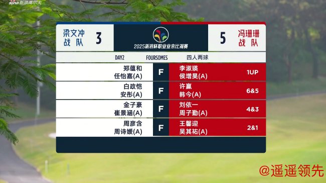 刘依一/周子勤连续第二天搭档,赢4洞剩3洞战胜金子豪/崔景涵。他们在前九洞赢5个洞,转场时领先3洞。第11洞,金子豪精彩进攻到4英尺,蓝队抓鸟扳回一洞。然而在第13、14洞,蓝队接连出现开球出界的失误,红队趁机连下两城,锁定了胜局。